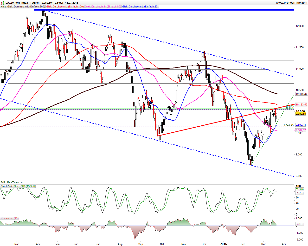 Die weitere Entwicklung im DAX hängt letztlich sehr stark davon ab, ob die US-Indizes an ihren bevorstehenden Widerstandsmarken in eine Korrektur übergehen. Mit Anschlusskäufen im S&P 500 bis 2.063 Punkten ist das Potential im DAX bis 10.415 Punkten sehr wahrscheinlich. Einer Korrektur in den US-Indizes wird sich auch der DAX nicht entziehen können und eine Abwärtsbewegung auf 9.500 und sogar 9.000 Punkte wären die Folge.
