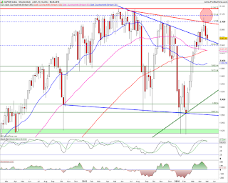 Gelingt es den Bullen aber nicht diesen Widerstandsbereich zu überschreiten, wäre ein nochmaliger Test der 2.039/44 einzuplanen, womit sich zugleich eine kleinere Schulter – Kopf – Schulter Formation ausbilden würde. Diese S-K-S ist eine Trendwendeformation und hätte dann die Gefahr eine größere Ausdehnung der Konsolidierung hin zu einer ausgewachsenen Korrektur einzuleiten. Das theoretische Ziel dieser S-K-S wäre dann der Unterstützungsbereich bei 1.972 Punkten.