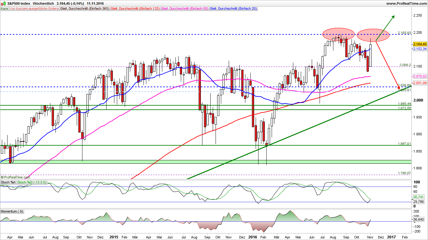 S&P 500 Wochenchart (mittelfristig): In der vergangenen Woche erreichte die US-Wahl ihren Höhenpunkt. Das Ergebnis war ähnlich dem Brexit für viele Marktteilnehmer sehr überraschend. Dennoch war die Absicherung vor der Wahl sehr hoch und nachdem das Ergebnis fest stand, kam es bis zum Ende der Woche zur Auflösung dieser Absicherungen. Der S&P 500 erholte sich infolge dessen bis an den wichtigen Widerstand bei 2.180 Punkten.