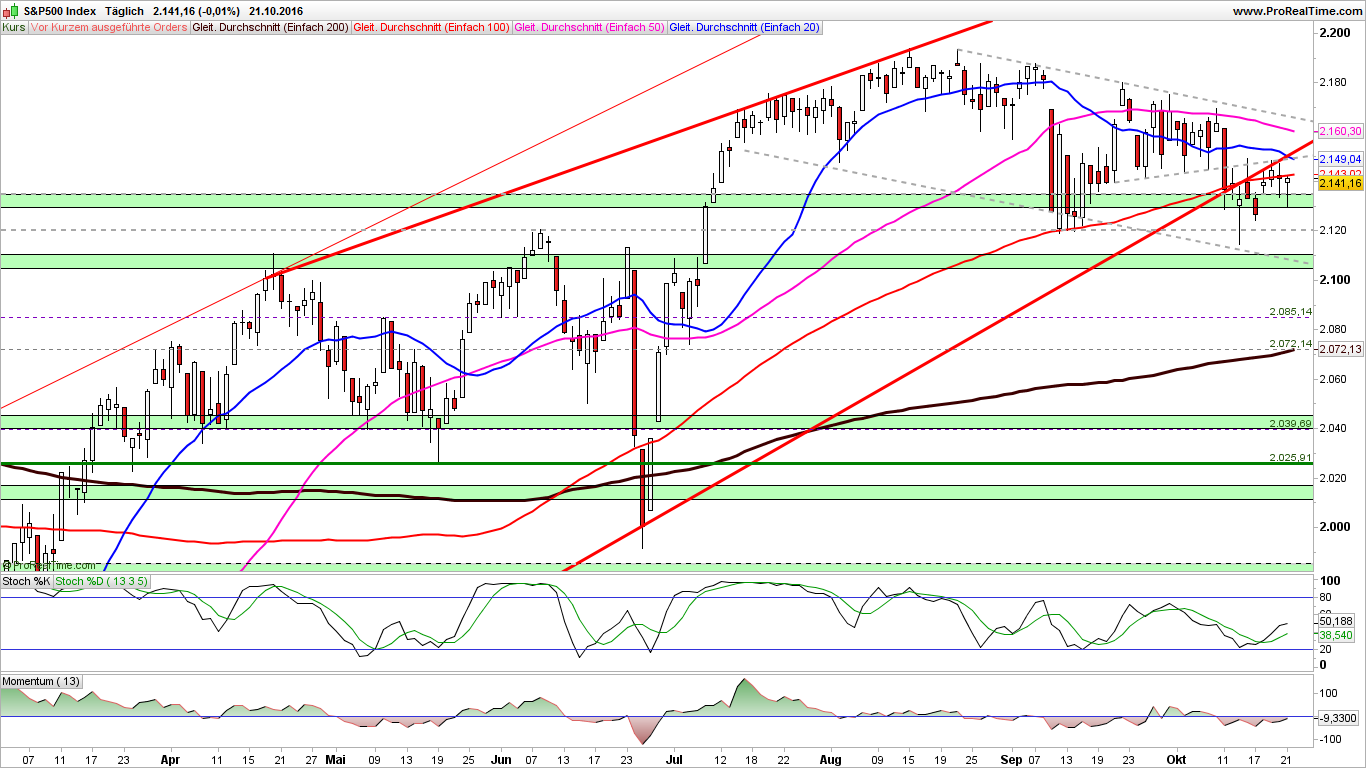 Der Trend bleibt somit weiterhin aufwärtsgerichtet. Die Bullen kaufen konsequent die wichtige Unterstützung bei 2.120 Punkten. Das bärische Zeitfenster welches saisonal im Oktober zu beobachten ist, schließt sich langsam. Die Wahrscheinlichkeit das mit Beginn des November die Käufer in den Markt zurückfinden steigt nun kontinuierlich an.