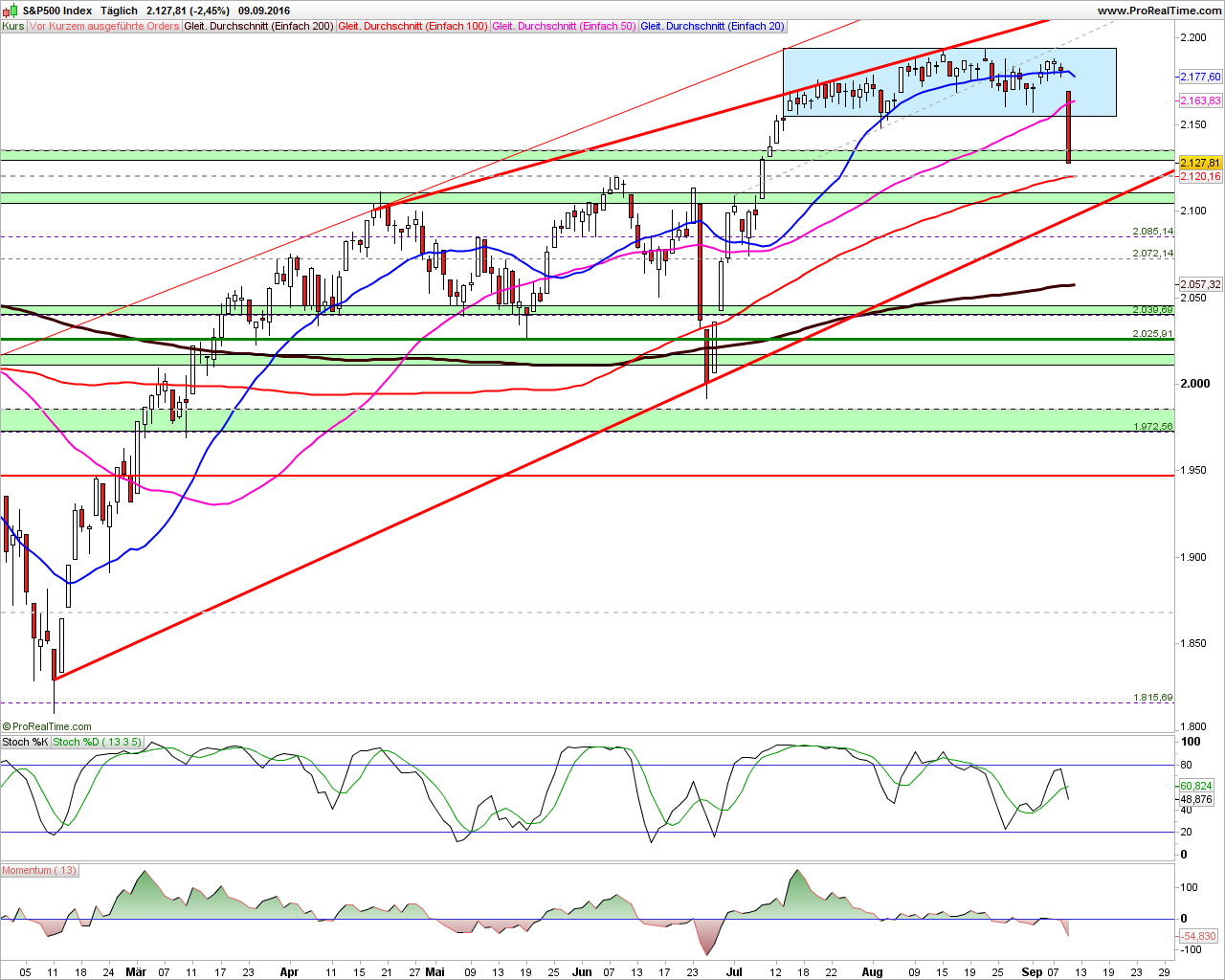 2016-September-12 US-Märkte & Indizes Wochenausgabe "Leitindex S&P 500 angeschlagen, weitere Verlauf auf der Kippe"