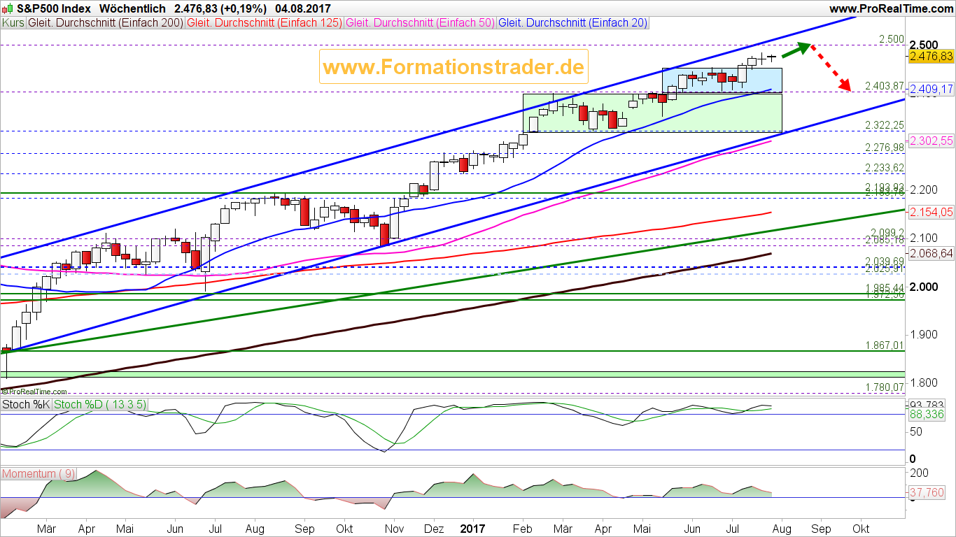 S&P 500 Wochenchart (mittelfristig): In den vergangenen zwei Wochen ist an den US-Märkten nur wenig passiert. Der S&P 500 bewegte sich typisch für die Sommerzeit in einer lustlosen Wochenrange. Die Wochenhandelsspanne blieb mit 14 Punkten sehr klein. Bis zu meinem nächsten Kursziel bei 2.500 Punkten fehlt aber letztlich nur eine kleine Bewegung von 24 Punkten. Bei Erreichen dieser Marke rechne ich mit einer größeren Konsolidierung oder gar Korrektur, die sich bis in den September hinein ausdehnen könnte. Doch Vorsicht: Charttechnisch ist diese Erwartung noch nicht belegbar und muss sich erst noch beweisen. Denn der langfristige und mittelfristige Trend sind aufwärtsgerichtet und intakt. Die Indikatoren bestätigen zudem das bullische Bild. Eine Fortsetzung des Trends ist daher wahrscheinlich. Aber, zwischenzeitliche Konsolidierungen und Korrekturen gehören dazu, sind normal und bieten uns ein gutes Chance/Risiko für neue Einstiege.