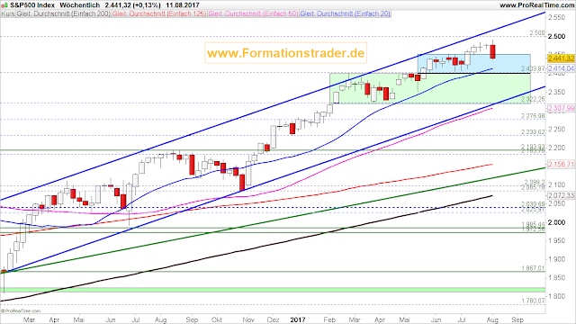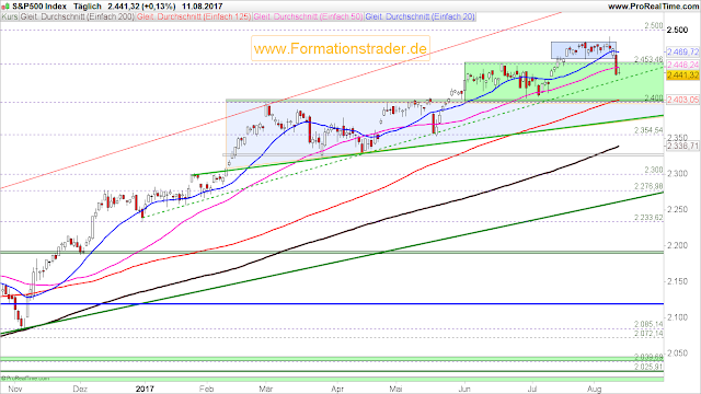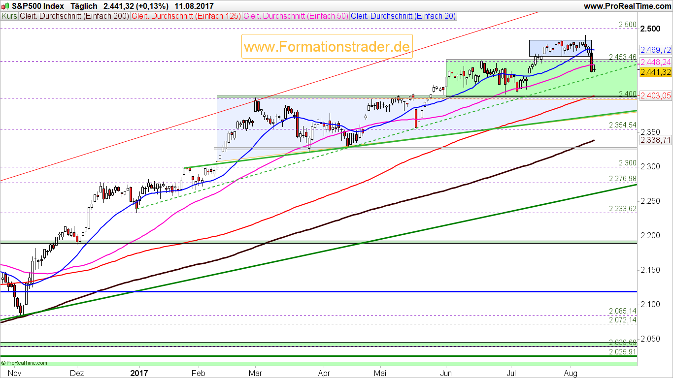 Fazit: Der mittelfristige Trend bleibt aufwärtsgerichtet. Kurzfristig befindet sich der S&P 500 in einer Konsolidierung mit weiterem Abwärtspotential. Mittelfristige Trader und Investoren halten sich daher mit Neueinstiegen zurück bis der S&P sein Konsolidierungspotential ausgeschöpft hat. Kurzfristige Intradaytrader hingegen können mit einer Erholung an die 2.460/65 einen Einstieg auf der Shortseite suchen, mit engem Stopp und einem Ziel bei 2.430 bis 2.400 Punkten. Welche erfolgreichen Einstiegs- und Ausstiegsstrategien wir nutzen, können Sie in unserem
