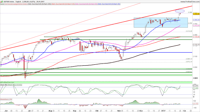 Der heutige Handelstag entscheidet über das Bild des Wochencharts. Fällt der Index bis zum heutigen Handelsschluss auf das Ausbruchsniveau (2.284) oder tiefer zurück, so würde sich daraus eine negative Wochenkerze ausbilden. Ein Wochenschlusskurs an der 2.300er Marke oder darüber, würde eine bullische Wochenkerze hinterlassen, der dann in der kommenden Woche weitere Käufe folgen dürften.