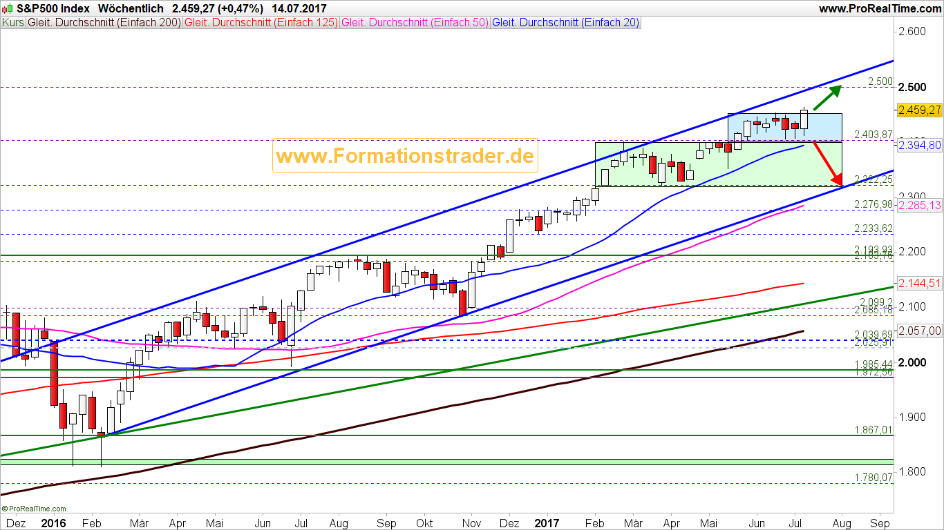 Auf der Oberseite wurde durch den Ausbruch aus der Konsolidierung das nächste Kursziel bei 2.500 Punkten aktiviert. Dieses Ziel kann in nur wenigen Tagen bis Ende Juli abgearbeitet sein. An der 2.500er Marke ist dann erneut mit einer Konsolidierung oder gar Korrektur zu rechnen, zumal mit dem Beginn des August eine saisonale Korrekturphase beginnt. Das Jahr 2017 würde mit Erreichen der 2.500er Marke im S&P 500 einen Gewinn von ca. + 11 % erreichen. Das weitere Potential auf der Oberseite sollte daher in der zweiten Jahreshälfte mit Erreichen unseres Ziels begrenzt sein und die Anfälligkeit für eine größere Korrektur wäre gegeben.