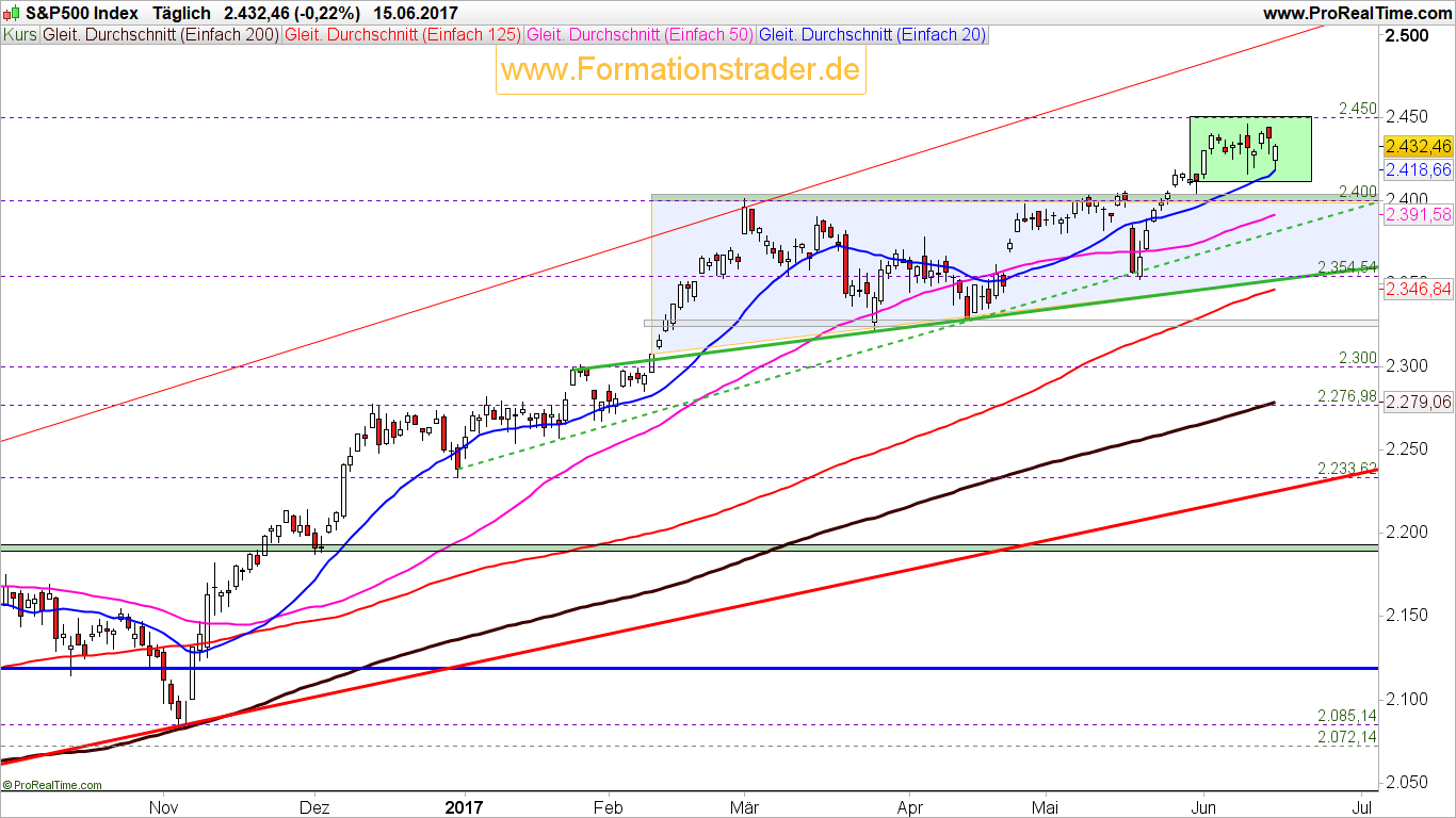 S&P 500 Tageschart (kurzfristig): Im Tageschart hat sich seit Anfang Juni eine Seitwärtsbewegung zwischen 2.416 und der 2.450 Punkten ausgebildet. Am vergangenen Donnerstag und Freitag diente der ansteigende 20 Tage gleitende Durchschnitt als Unterstützung, die jeweils mit den Tagestiefstkursen getestet wurde. Das die Bullen diesen gleitenden Durchschnitt verteidigt haben ist kurzfristig bullisch zu bewerten.