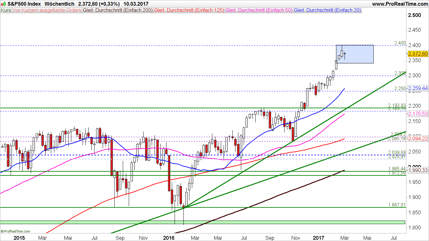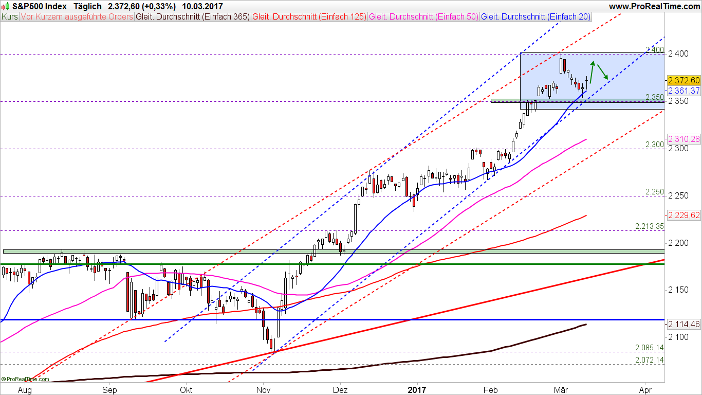 S&P 500 Tageschart (kurzfristig): Auf Tagesbasis hält sich der S&P 500 an unseren Plan. Der Test der 2.350er Unterstützung führte zu einer kurzfristigen Gegenbewegung, die sich noch ein paar Tage fortsetzen kann. Die überkaufte Markttechnik baut sich damit weiter ab. Eine Fortsetzung des kurzfristigen Aufwärtstrends auf neue Allzeithochs, ist aber derzeit zumindest bis zum 15.03.17 vor der FED-Sitzung eher unwahrscheinlich.