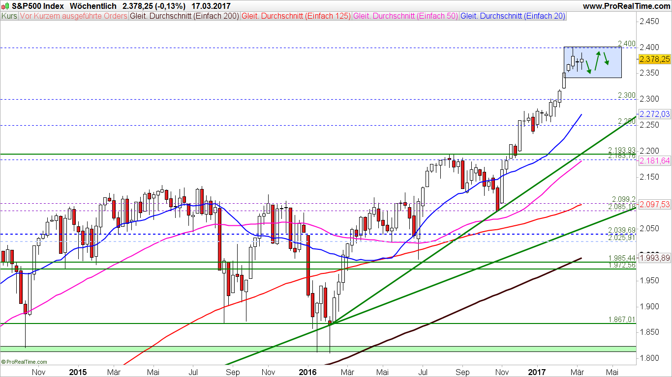 S&P 500 Wochenchart (mittelfristig): Wie in der letzten Wochenausgabe beschrieben, brachte die vergangene Handelswoche nur wenig Bewegung mit sich. Trotz FED-Sitzung und Verfall an der Terminbörse verlief die Handelsspanne der gesamten Wochen in einer Range von 22 Punkten. Die Konsolidierung setzt sich so auf hohem Niveau weiter fort. Innerhalb dieser Konsolidierung ist ein nochmaliger Test der 2.400er Marke durchaus wahrscheinlich. Da aber schnelle unerwartete Richtungswechsel mit entsprechenden Fehlsignalen in engen Seitwärtsbewegung eher die Regel als die Ausnahme sind, ist innerhalb der Konsolidierung für Positions- und Swingtrader Zurückhaltung angebracht. Enge Seitwärtskonsolidierungen bleiben eher den Daytradern vorbehalten.
