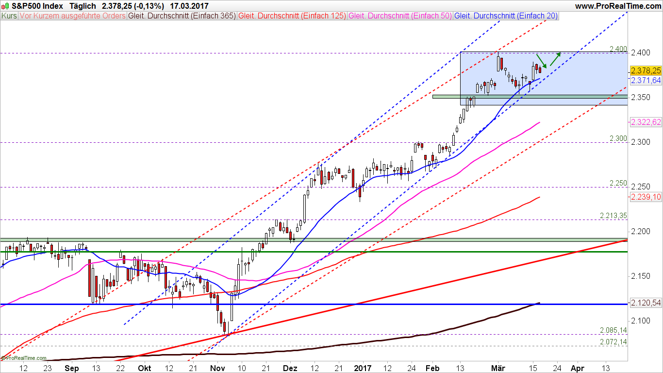 Oberhalb der 2.350er Marke besitzt die aktuelle Konsolidierung einen bullischen Charakter und ist als Trendbestätigen zu bewerten. Sollte in den kommenden Tagen die 2.350er Marke unterschritten werden, ist einer Ausdehnung der Konsolidierung bis 2.300 Punkte sehr wahrscheinlich. Solange aber die 2.300er Marke dabei von den Bullen verteidigt wird, bleibt der kurzfristige Trend aufwärtsgerichtet.
