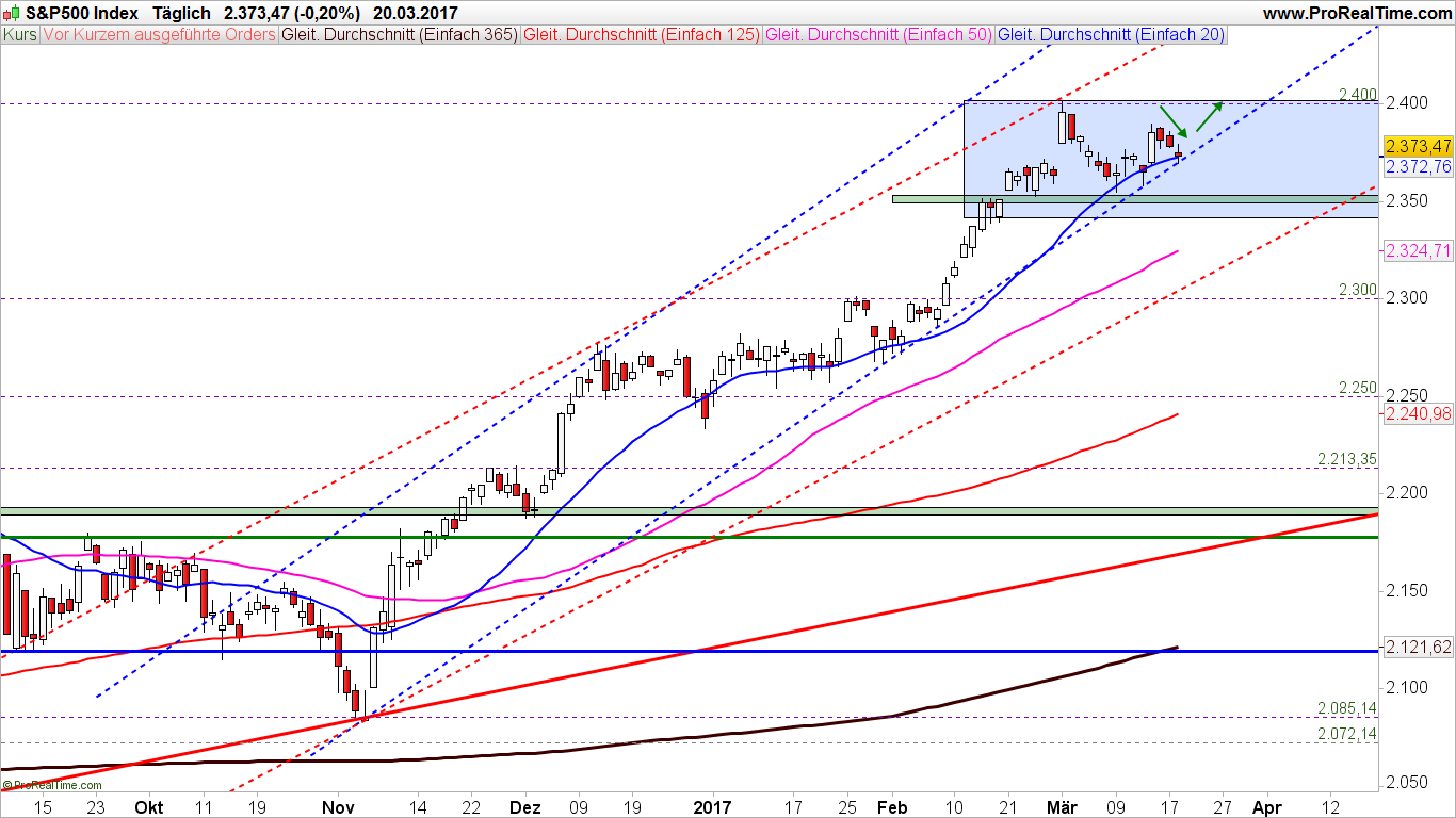 2017-März-21 US-Märkte & Indizes Tagesausgabe "Der Test der Aufwärtstrendlinie entscheidet über den weiteren Verlauf"