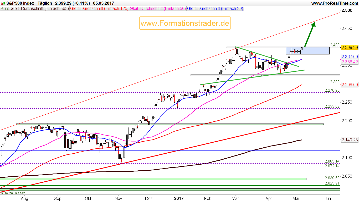 S&P 500 Tageschart (kurzfristig): Auf Tagesbasis probte der S&P 500 am Freitag zum Handelsende den Ausbruch aus seiner seit 7 Tagen laufenden High-Base-Konsolidierung. Am heutigen Sonntag werden mit den finalen Wahlen in Frankreich bereits mögliche Weichen für den morgigen Wochenauftakt gesetzt. Die Wahrscheinlichkeit für einen Ausbruch aus der Konsolidierung ist hoch, sofern keine Überraschungen aus Frankreich veröffentlicht werden. Auch im Tageschart unterstützen die Indikatoren einheitlich weiter steigende Kurse. Vorsicht ist jedoch geboten, wenn der Index bereits mit einer größeren Kurslücke oberhalb der 2.400er Marke eröffnen würde. In diesem Fall besteht die Gefahr, dass die hohen Kurse für einen Abverkauf genutzt werden, und der nachhaltige Ausbruch misslingt.