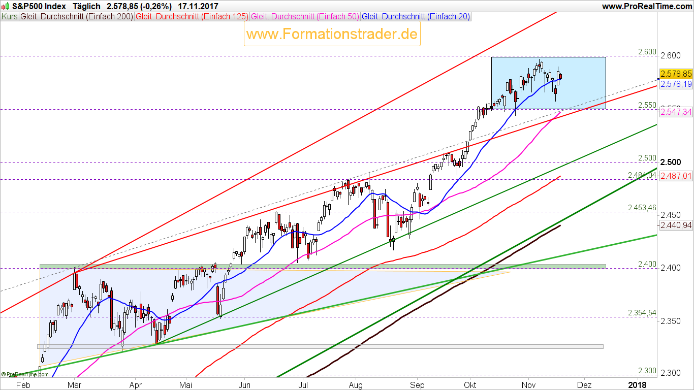 Fazit: Der kurzfristige und mittelfristige Trend sind aufwärtsgerichtet aber in einer Konsolidierung. Diese Konsolidierung ist derzeit sowohl für den mittelfristigen als für den kurzfristigen Trend nicht gefährlich. Für einen Neueinstieg bietet sich auf aktuellem Niveau kein gutes Chance/Risiko-Verhältnis. Für den passenden Einstieg warten wir daher den Verlauf der aktuellen Konsolidierung ab, bis sich eine Trendfortsetzungsformation ausgebildet hat oder ein direkter Test der 2.550er Marke statt findet. Ein Einstieg bei Aktien ist nach dieser Konsolidierung ausschließlich auf der Longseite zu suchen.