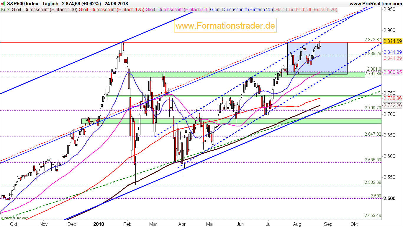 Schaut man sich den Wochenchart an, so gibt es derzeit keine Horizontalwiderstände mehr die auf dem Weg zur 3.000 Punktemarke den Weg versperren. Dennoch befindet sich der Index nahe der mittleren trendbegrenzenden Linie des mittelfristigen Aufwärtstrendkanals. Diese Linie kann den Bullen einen nachhaltigen Ausbruch über die 2.872 noch vermiesen. Klare Hinweise darauf sind derzeit jedoch noch nicht zu beobachten.