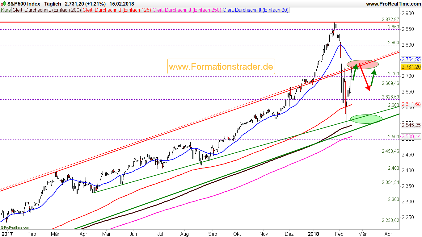 2018-Februar-16 Leitindex S&P 500 Tagesausgabe "Zielbereich erreicht – Konsolidierung wahrscheinlich"