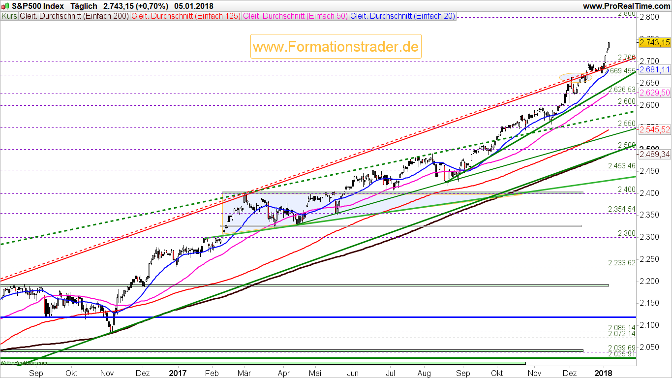 In der vergangenen Handelswoche konnte der S&P 500 als Weltleitindex einen sehr beeindruckenden Jahresstart vorweisen. Mit diesem Start sind sämtliche noch herleitbaren Widerstände aus dem Weg geräumt und dienen nun als wichtige Unterstützung innerhalb der Aufwärtsbewegung. Der langfristige Aufwärtstrendkanal ist auf der Oberseite verlassen worden.