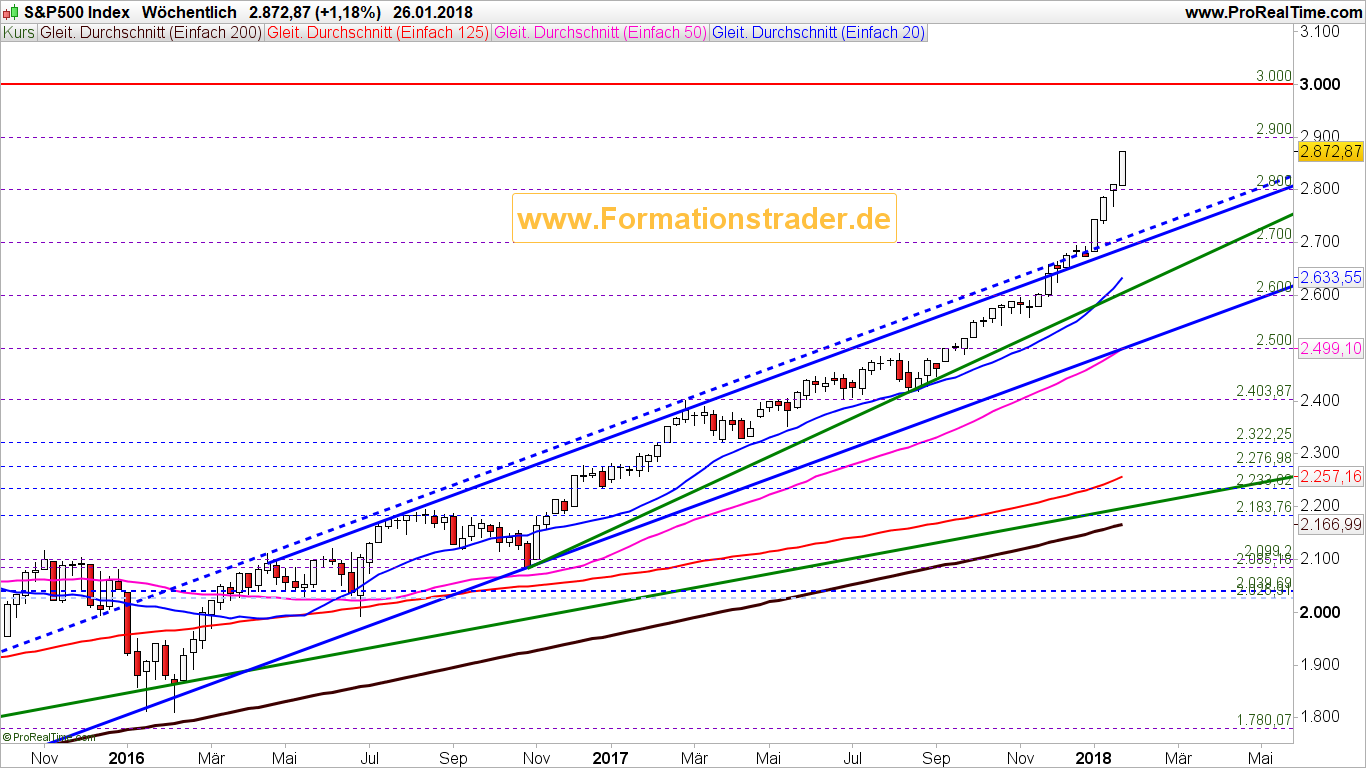 Wochenchart (mittelfristig): In der letzten Handelswoche gelang es den Bullen erneut mit dem Wochenschlusskurs bei 2.873 Punkten ein neues Allzeithoch zu erreichen. Mit einem höheren Hoch und einem höheren Tief zur Vorwoche ist der Trend ganz klar intakt und als bullisch zu bezeichnen.