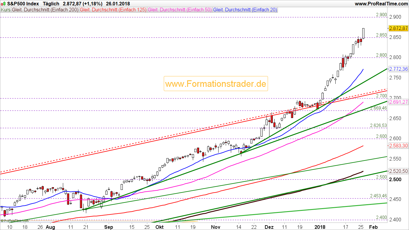 Tageschart (kurzfristig): Im Tageschart konnte der S&P 500 den Freitagshandel direkt am Tages und Wochenhoch beenden. Die Wahrscheinlichkeit, dass der S&P 500 daher zum Beginn der kommenden Woche erneut ein neues Allzeithoch erreicht, ist sehr hoch. Die nächste Zielmarke befindet sich bei 2.900 Punkten. Das mittelfristige Ziel bei 3.000 Punkten ist als psychologischer und nächster stärkerer Widerstand genau im Auge zu behalten. Sowohl bei 2.900 und erst recht bei 3.000 Punkten ist mit einer Konsolidierung oder gar größeren Korrektur zu rechnen.