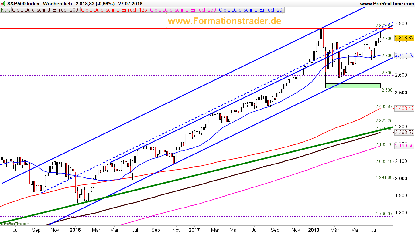 Wochenchart (mittelfristig): In der vergangenen Wochenausgabe schrieb ich: …S&P 500 beendete die vergangenen Handelswoche in Form eines Dojis. Dojis sind grundsätzlich Kerzen die zur Vorsicht mahnen, wenn sie sich direkt nach einer Auf- oder Abwärtsbewegung ausbilden. Im Fall der letzten Handelswoche könnte daher diese Doji Kerze eine Indikation für eine bevorstehende Konsolidierung am wichtigen 2.800er Widerstand sein.