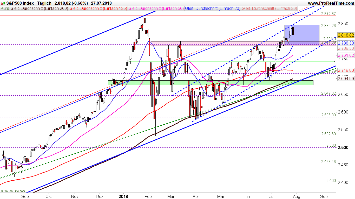 Aber dennoch der kurzfristige Trend ist aufwärtsgerichtet und intakt, solange der gestrichelte blaue Aufwärtstrendkanal im Tageschart nicht auf der Unterseite verlassen wird. Unterstützungen können daher zum kurzfristigen Einstieg genutzt werden. Bitte achten Sie dabei darauf, dass das Potential auf der Oberseite durch den 2.840/48er Widerstand begrenzt ist und selektieren Sie Ihre Einstiege entsprechend stark.