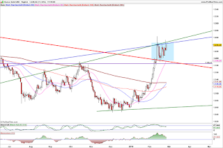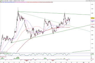 Gut unterstützt wird Gold nun im Bereich von 1190,00 - 1210,00 durch die steigende 20 Tage Linie, die fallende Trendlinie des Bullkeils im Tag (rot), die 200h Linie (aktuell bei 1218,00) sowie der unteren Trendlinie des bullischen Wimpels. Mit diesem Unterstützungscluster im Rücken ist die Wahrscheinlichkeit einer bullischen Fortsetzung in Richtung 1300,00 sowie übergeordnet 1340,00 (200 Wochenlinie) aktuell höher.