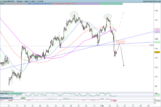 Die Devisenpaarung befindet sich übergeordnet im Abwärtstrend und bewegt sich im Tageschart in einem Trendfortsetzungsmuster (bärischen Wimpel). In den letzten Handelstagen hat sich über den Stundenchart ein Doppeltop gebildet, dessen Nackenlinie heute bei 1,6430 regelkonform aufgelöst wurde. Des Weiteren wurde die 20-Tage-Linie bei 1,6478 bärisch aufgegeben.