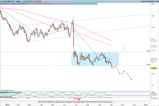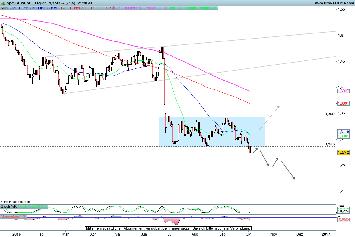 Mit dem heutigen Handelstag verlässt die Paarung, die seit drei Monaten andauernde Seitwärts-Phase im Bereich von 1,2860 auf der Unterseite und löst damit ein größeres Verkaufssignal aus. Die Wahrscheinlichkeit ist hoch, dass das Paar in den nächsten Tagen und möglicherweise Wochen den Trend fortsetzt. Die nächsten Ziele wären grob im Bereich von 1,23 bis 1,20 zu finden.