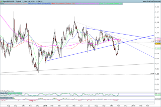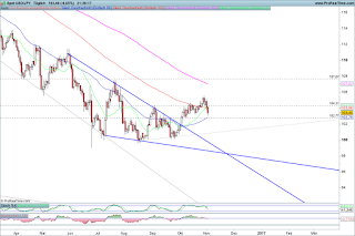 Aufgrund der positiven Korrelationen dieser Paarung zu den Aktienmärkten konnte der bullische Ausbruch über 104,30 nicht verteidigt werden. Das Paar fällt wieder unter die horizontale Linie sowie steigende 20-Tage-Linie (aktuell bei 104,02) zurück. Die Indikatoren im Tag wechseln in Verkaufsmodus und das am 27.10.16 vorgestellte bullische Setup ist zunächst passe.