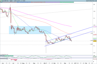 Das Paar löste am 15.12.16 die Bärenflagge bei 1,2530 in Trendrichtung auf und fand zunächst Unterstützung an der vorgestellten 50-Tage-Linie bei 1,2410. Auch diese wurde bärisch aufgegeben. Aktuell präsentiert sich die Paarung weiterhin schwach und bildet im Bereich der horizontalen Linie bei 1,2345 über den Stundenchart ein Trendfortsetzungsmuster (bärischer Wimpel).